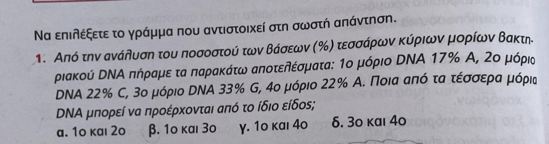 Έχω σκαλώσει άσχημα. Εγώ σκέφτηκα πως είναι το γ αν σκεφτούμε πως Α=Τ και G=C (Α:10% Τ:10% G: 40% C: 40%) αλλά κάποιος μου είπε πως είναι το δ. Λόγω του ότι μιλάμε για δίκλωνο τμήμα DNA και μονόκλωνο RNA…