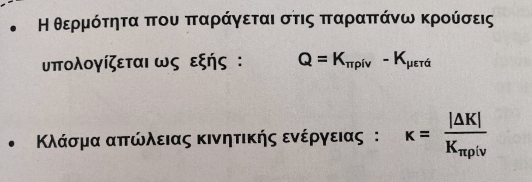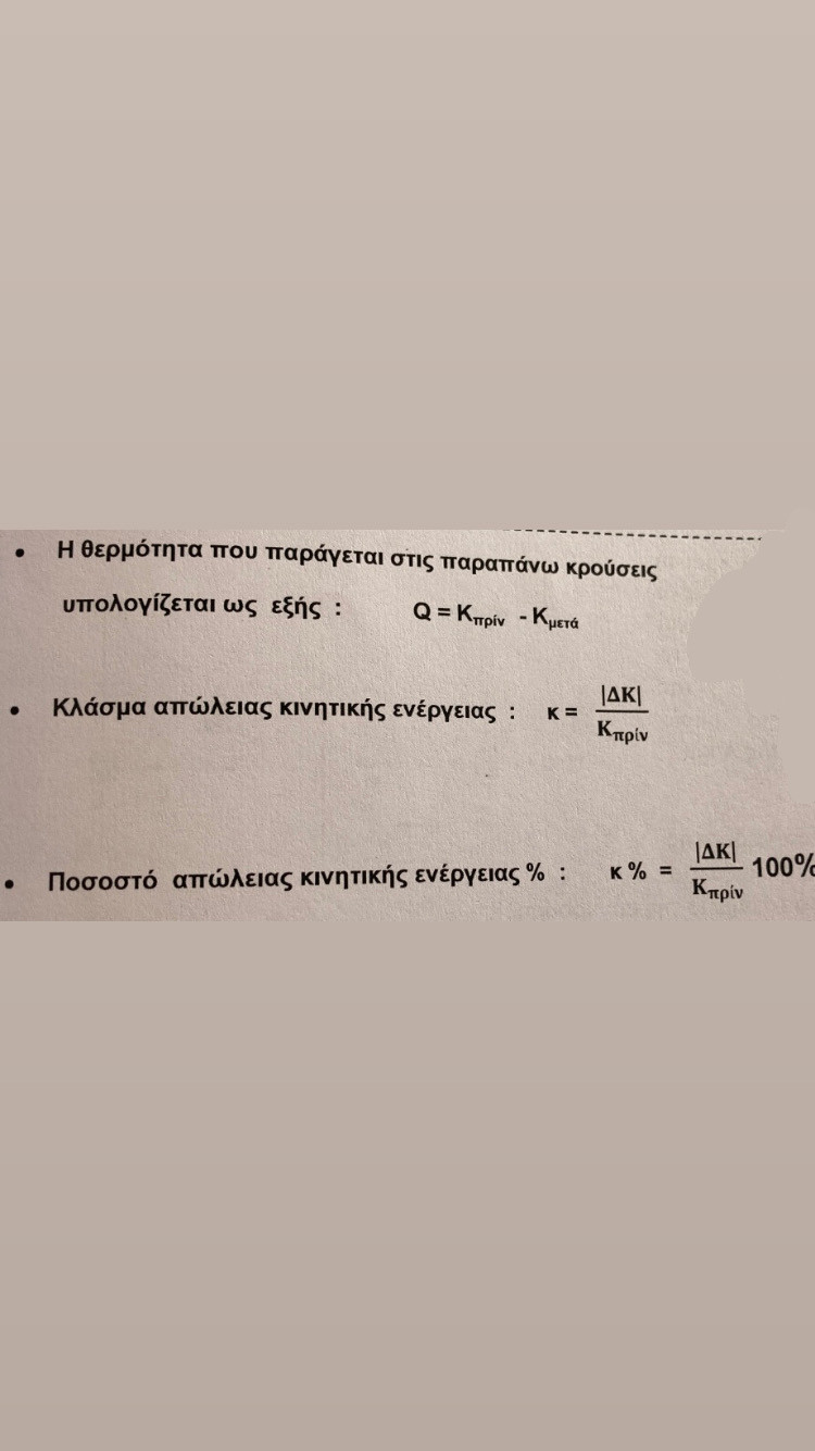 Για ποσοστό μου έχει το ίδιο κλάσμα αλλά επί 100. Γι’αυτό αναρωτιόμουν. Ευχαριστώ πολύ.Ουσιαστικά το κλάσμα αντιπροσωπεύει το ποσοστό της κινητικής ενέργειας που χάθηκε όχι την κινητική ενέργεια που χάθηκε αυτή καθεαυτή. Άρα η απώλεια κινητικής ενέργειας είναι το Καρχ-Κτελ όχι το κλάσμα το κλάσμα είναι το ποσοστό της απωλειας κινητικής ενέργειας