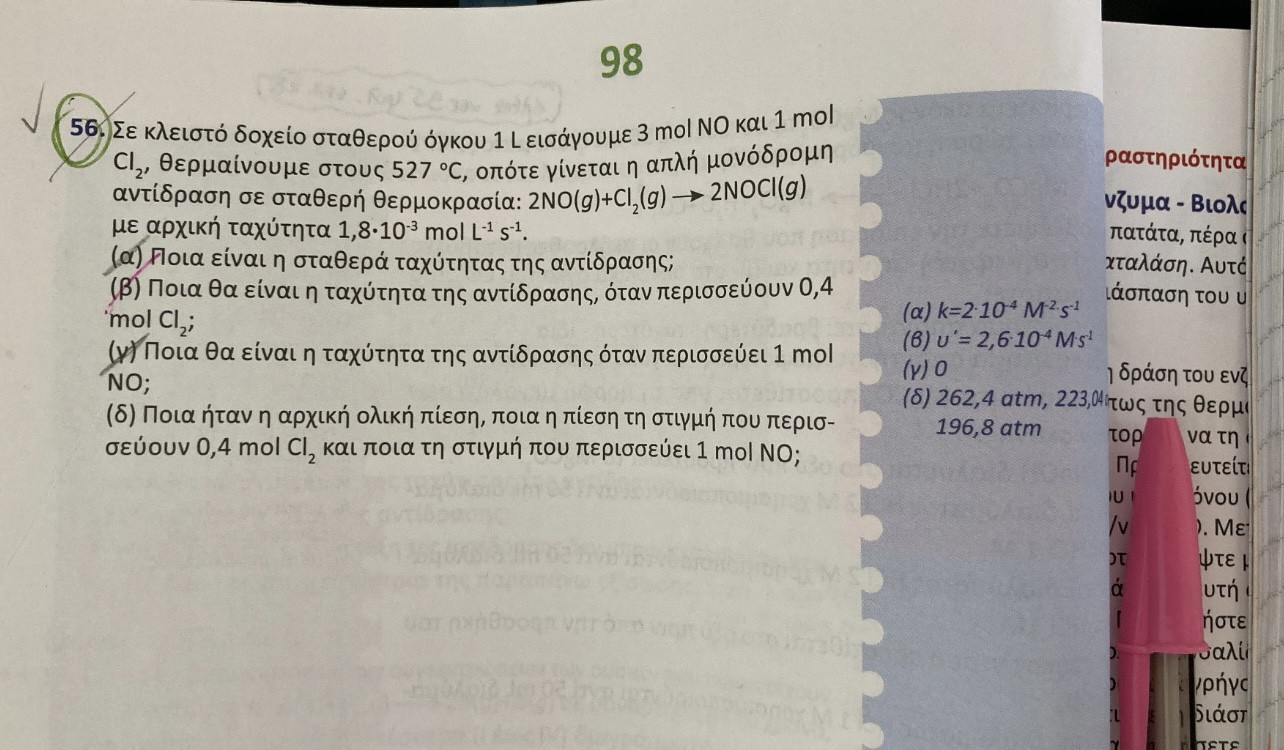 Πρακτικά με τα δεδομένα που σου δινει βρίσκεις το x, συνεπώς και τα τελικά mol των αερίων. Μετά τα περνάς στην καταστατικήΧωρίς καμία πρόθεση να σας βάλω πάλι στο κλίμα των Πανελληνίων τώρα που πήρατε τους βαθμούς σας, θα εκτιμούσα μια μικρή βοήθεια σε ένα υποερώτημα. Το έχω λύσει ήδη σε πρόχειρο αλλά δεν μπορώ να εντοπίσω το λάθος μου.