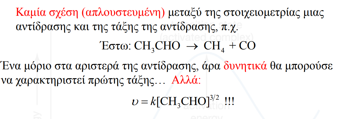 Ωστόσο το σχολικό αναφέρει τα εξής : "Σε περίπτωση που οι εκθέτες χ, ψ ταυτίζονται με τους συντελεστές της χημικής εξίσωσης α και β, δηλαδή χ = α και ψ = β, τότε η αντίδραση πραγματοποιείται με τον απλό μηχανισμό που περιγράφει η χημική εξίσωση. Σε αντίθετη περίπτωση, αν δηλαδή χ ≠ α ή ψ ≠ β, τότε η αντίδραση δεν είναι απλή δηλαδή πραγματοποιείται σε περισσότερα στάδια."