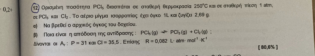 Για το πρώτο ερώτημα, το γεγονός ότι σου δίνει θερμοκρασία και πίεση και σου ζητά όγκο πρέπει να σε προϊδεάζει για καταστατικη εξισωση. Ο τύπος είναι pv=nRt ως γνωστόν και λύνεις ως προς v με μόνο άγνωστο τα Mol του pcl5. Όμως η εκφώνηση δίνει άλλο ένα δεδομένο, την ολική μάζα στο τελικό μείγμα. Επειδή στη χημεία ισχύει η αρχή διατήρησης της μάζας καταλαβαίνεις ότι κατά τη διάρκεια όλης της αντίδρασης η μάζα διατηρείται σταθερή σε κάθε χρονική στιγμή, άρα από εκεί μπορείς να βρεις τα αρχικά mol, αφού γνωρίζεις την αρχική μάζα.
