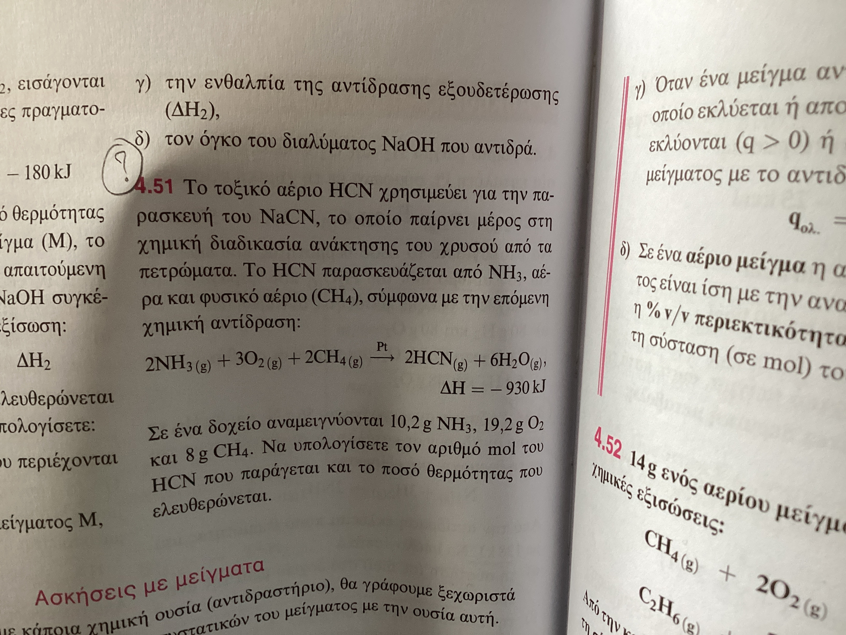 Από τις μάζες κάθε ένωσης θα βρεις τα Mol της διαιρώντας με το Mr. Κατόπιν για να προσδιορίσεις ποια είναι σε έλλειμμα, δηλαδή ποια θα αντιδράσει πλήρως, διαιρείς τα μολ της κάθε ένωσης με τον συντελεστή της στη χημική εξισωση και όποιος αριθμός σου βγει μικρότερος αντιστοιχει στην ένωση σε έλλειμμα. Εδώ έχεις 0.6 Mol nh3, 0.6 Mol o2 και 0.5 Mol ch4Καλημερα. Επειδη είμαι ένα στάδιο πριν το απόλυτο meltdown, μπορεί κάποιος να μου δείξει πως στα κομμάτια λύνεται αυτό; Είμαι ο απόλυτος νουμπας στη χημεία, έχω να κάνω από το 2013 και διαβάζω μόνος μου.. ακόμη περισσότερο νουμπας είναι ο σαλτερης που δεν έχει ουσιαστικές λύσεις, αλλά ναι..Κάτι παίζει με την περίσσεια αλλά δεν έχω καταλάβει πως δομώ τον πίνακα και γενικότερα τι παίζει με αυτή.