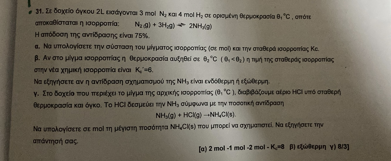 χωρίς να είμαι σίγουρη γιατί κι εγώ έχω ψιλοξεχάσει την χημεία, νομίζω πως η ποσότητα του παραγόμενου χλωριούχου αμμωνίου είναι μέγιστη όταν η ποσότητα της αμμωνίας είναι μέγιστη. Αυτό συμβαίνει στην περίπτωση που η αρχική αντίδραση σχηματισμού της αμμωνίας γίνει μονόδρομη, όταν δηλαδή αντιδράσουν πλήρως οι αρχικές ποσότητες αζώτου και υδρογόνου. Το άζωτο βρίσκεται σε περίσσεια και το υδρογόνο αντιδρά πλήρως, οπότε η ποσότητα της παραγόμενης αμμωνίας είναι τα 2/3 της ποσότητας του υδρογόνου δηλαδή 8/3.View attachment 110412Το γ… Πως το σκεφτόμαστε; Έχω σπάσει λίγο το κεφάλι μου.