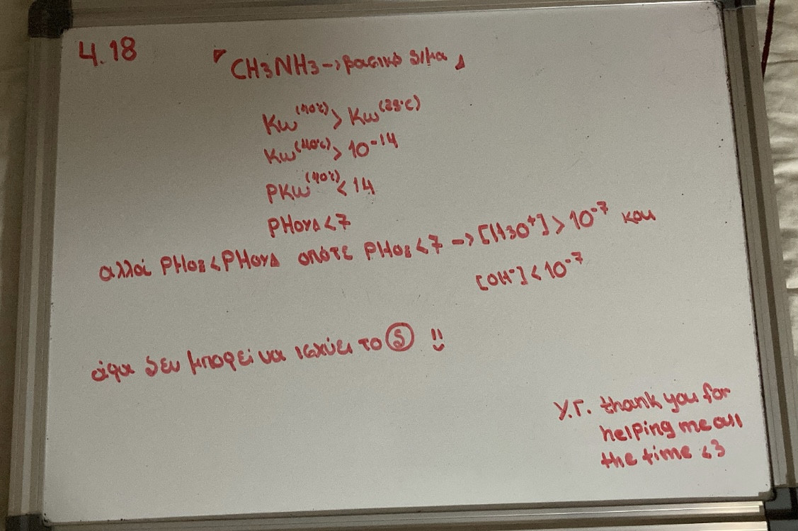 Έχεις πει αρχικά ότι το pH όξινου είναι μικρότερο από το pH ουδέτερου. Όμως το διάλυμα της εκφώνησης δεν είναι βασικό;;Έτσι ακριβώς μας το έλυσε στον πίνακα. Τι να σας πω. Είπε επειδή αυξάνεται η θερμοκρασία και έχουμε και βασικό δ/μα ισχύει αυτό. Αν ήταν στους 25 βαθμούς και ήταν βασικό θα ίσχυε αυτό που λέτε πιο πάνω και εσείς.