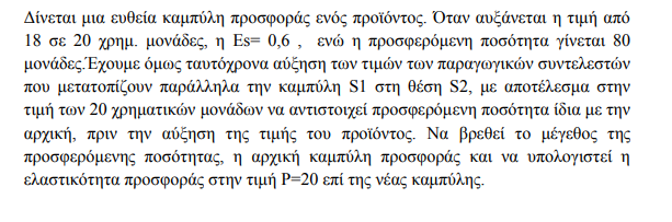 Έχω βρει τη νέα συνάρτηση προσφοράς και έχω ένα μόνο σημείο, για P=20. Αν κατάλαβα καλά, βρίσκω την ποσότητα που αντιστοιχεί σε P=18 και υπολογίσω την ελαστικότητα;(στη νέα καμπύλη πάντα). Στο τελευταίο ερώτημα αναφέρομαι.