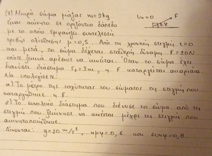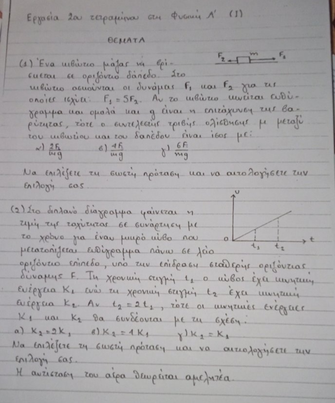 Αρχική Δημοσίευση από John kon: Θα το εκτιμούσα παρά πολύ αν θα με βοηθούσε το φόρουμ με έστω και μια από τις σημαντικές ασκήσεις που παραθέτω. Εγώ κάτι προσπάθησα, αλλά δυστυχώς ή ευτυχώς είμαι τις θεωρητικής Click για ανάπτυξη... Στο πρώτο είναι το β. Αφού κινείται ευθύγραμμα και ομαλά ισχύει οτι ΣF=0. Αντικαθιστώντας τις δυνάμεις που ασκούνται στο σώμα θα πάρεις το ζητούμενο