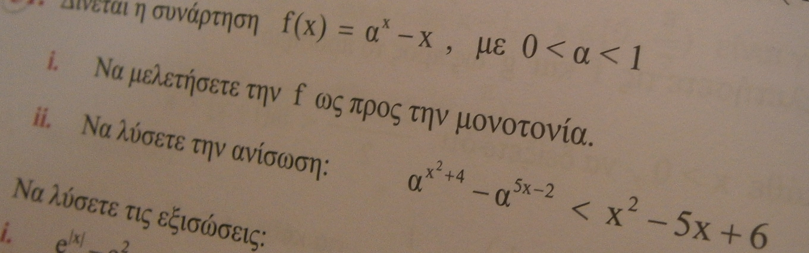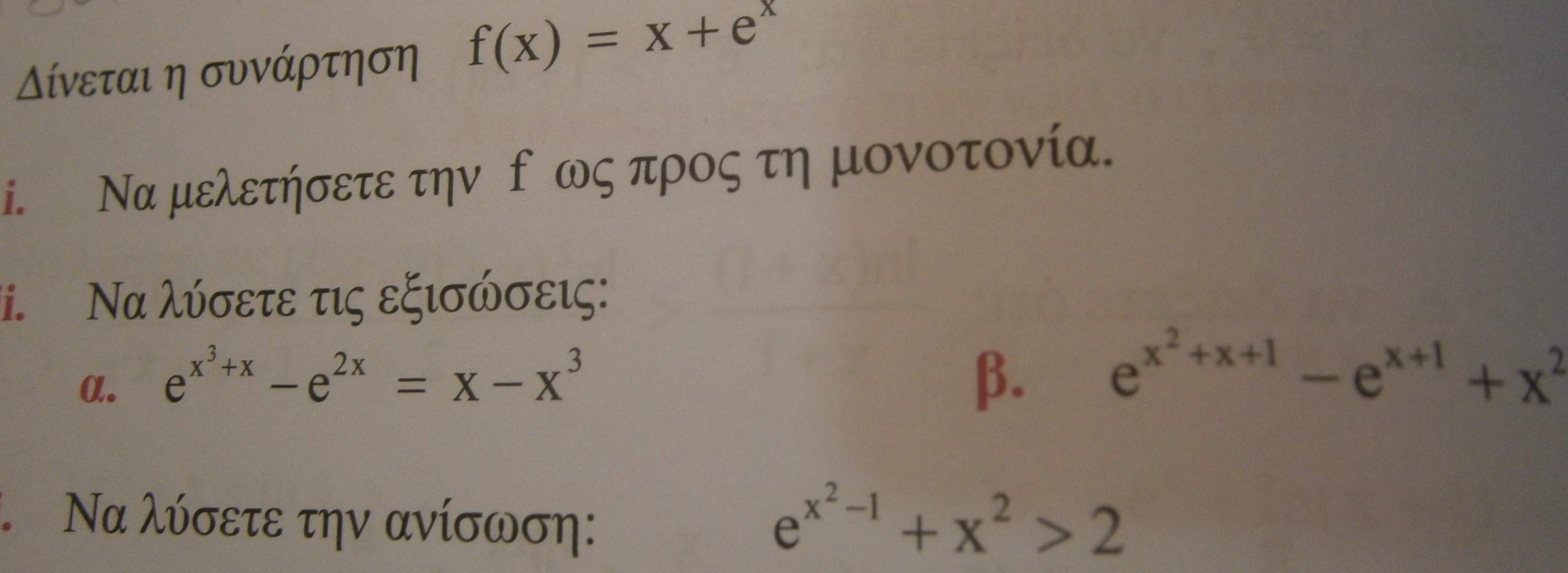 Το κόλπο σ'αυτές τις ασκήσεις είναι να εκμεταλλευτείς τη μονοτονία γράφοντας την ανίσωση/εξίσωση ως f(κάτι)>f(κάτι άλλο) ή f(κάτι)=f(κάτι άλλο). Πολλές φορές χρειάζονται προσθαφαιρέσεις για να γίνει αυτό.θΑ ήθελα βοηθεια στις παρακάτω δύο ασκησεις!! Ειναι από τον μπάρλα σελ. 124 μέχρι και μονοτανία ακρότατα