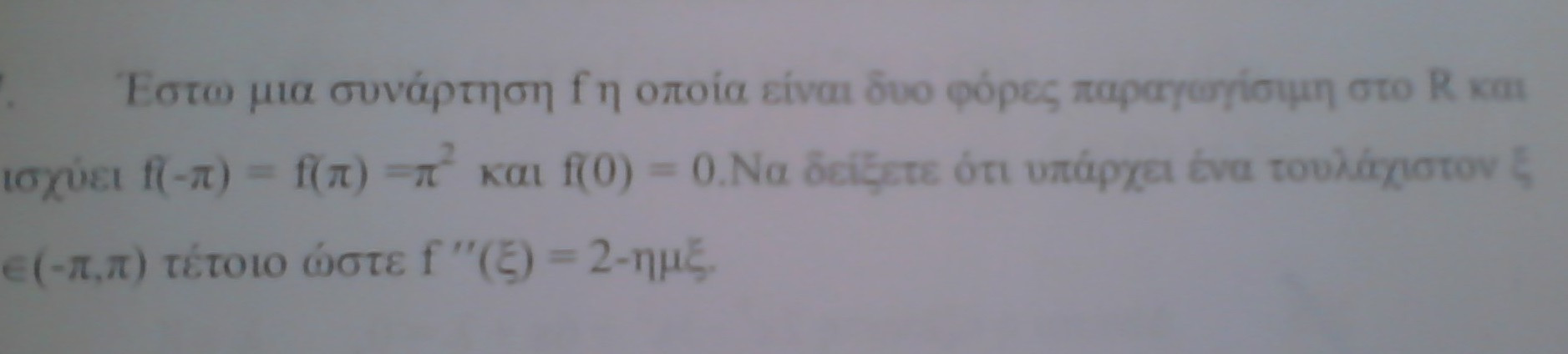 στην 1η ασκηση εκανα 2 Θ.Μ.Τ. στα [-π,0] με f'(ξ1)=-π και [0,π] f'(ξ2)=π και μετα rolle στην f'' στο [-π,π]....αλλα δεν κατεληξα σε κατι σωστο....δεν μου φαινεται και πολυ σωστη η ιδεα μ..