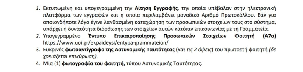 επισης μας μετεφεραν την αρχη των μαθηματων αλλη μια εβδομαδα πιο μεταΛοιπόν το ΕΚΠΑ (τουλάχιστον) για την σχολή μου ζητάει απλά εκτυπωμένη την αίτηση, 1 φωτοτυπία ταυτότητας και 1 φωτογραφία τύπου ταυτότητας. Με sms θα στείλει τους αριθμούς μητρώου για να γίνει εγγραφή στις υπηρεσίες του πανεπιστημίου