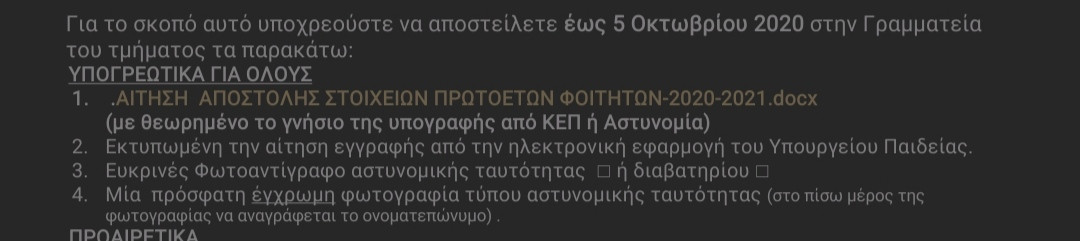 <Σας αποστελω τα δικαιολογητικα που επιθυμειτε για την εγγραφη μου και σας παρακαλω να με γραψεται στο πρωτο εξαμηνο του τμηματος ταδε........