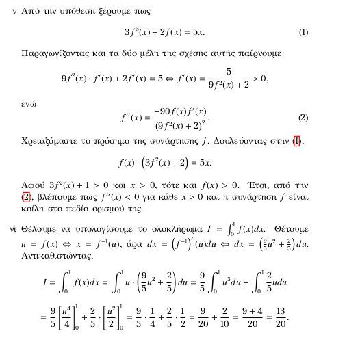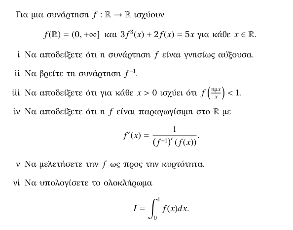 Η διαφορά με την άσκηση του ανωτέρω βιβλίου είναι πως πείραξα το σύνολο τιμών. Στο βιβλίο δίνεται σαν σύνολο τιμών όλο το σύνολο των πραγματικών αριθμών. Αυτή η υπόθεση επηρεάζει ουσιαστικά την επίλυση του ερωτήματος (i). Δοκιμάστε την!