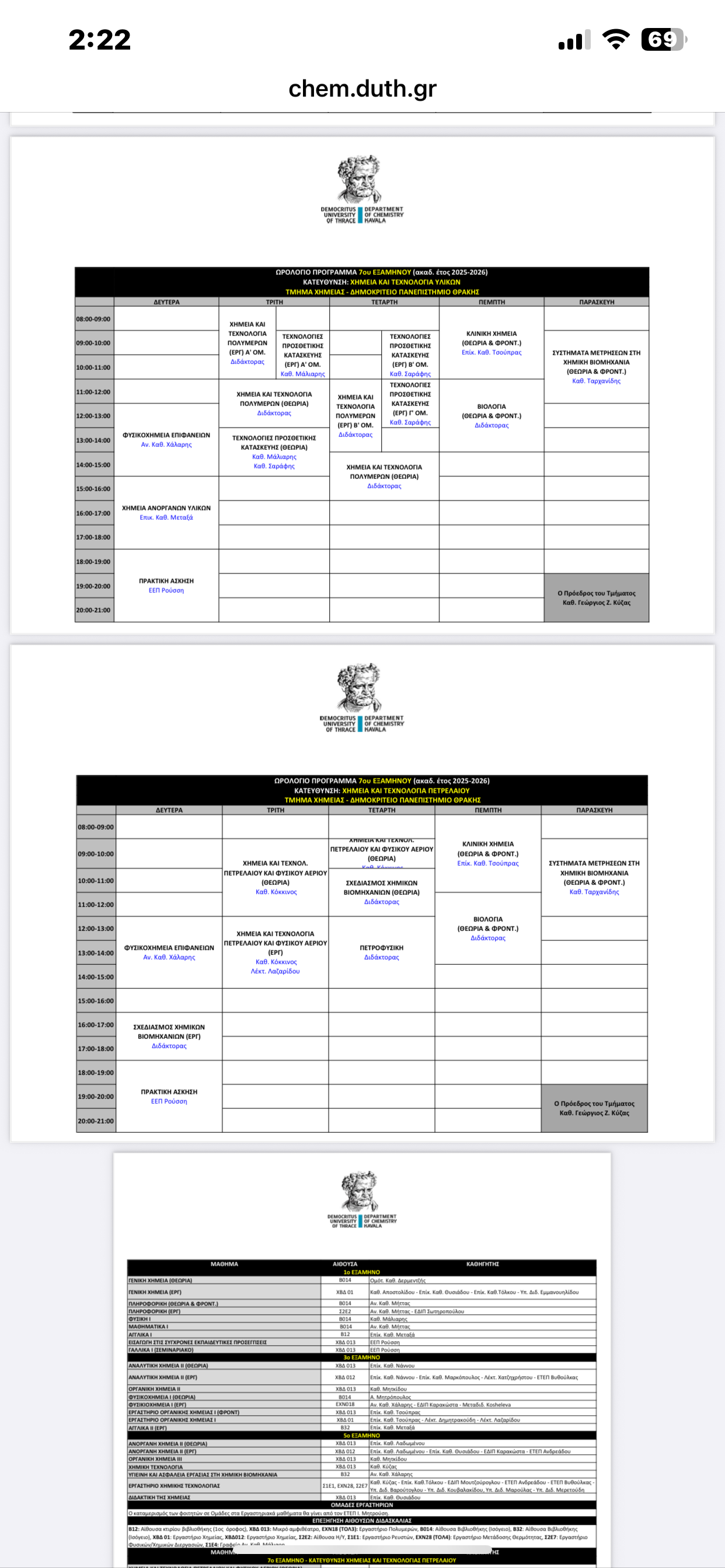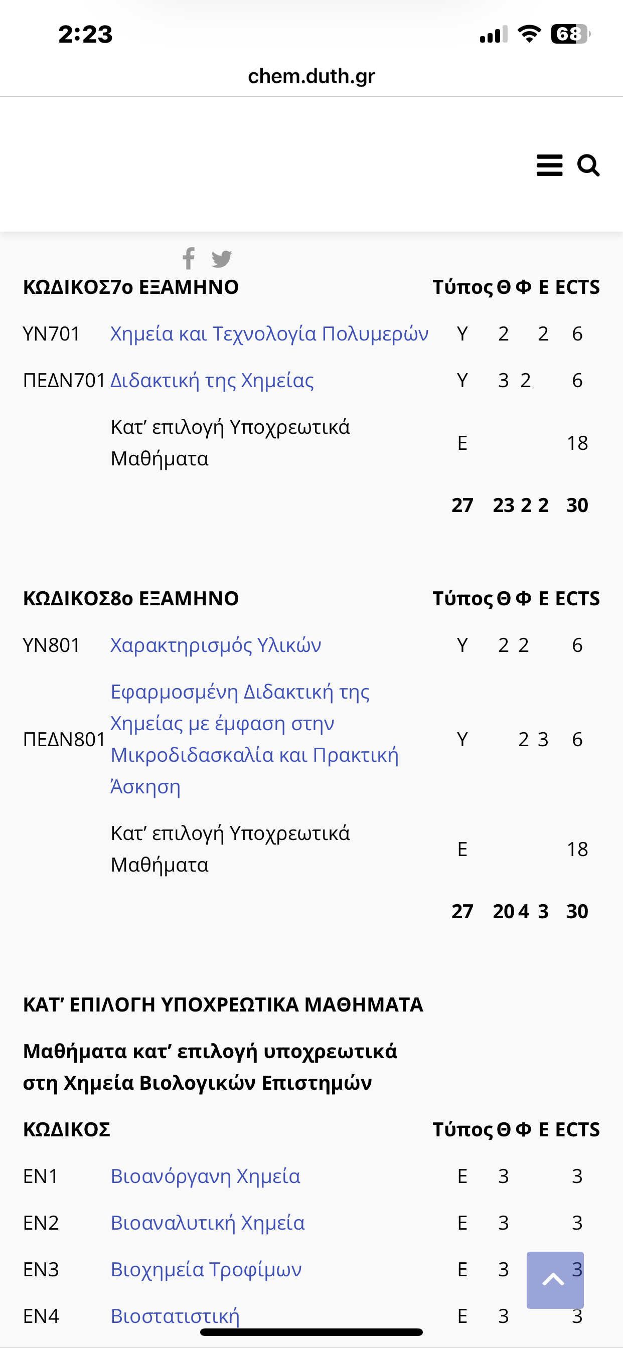 Οι πρώτες φωτογραφίες είναι οι διαφορετικές κατευθύνσεις που σου δίνει το νέο πρόγραμμα σπουδών από την σελίδα του ΔΠΘ που επιλέγεις στο 7 ο εξάμηνο και η τελευταία είναι το ωρολόγιο φετινό πρόγραμμα του 7 ου εξαμήνου που σου δίνει επιλογή μόνο σε δυοΜπαίνω στην σελίδα ΔΠΘ τμήμα Χημείας και βλέπω τα μαθήματα του νέου προγράμματος. Στο 7 ο εξάμηνο σου δίνει πέντε διαφορετικές κατευθύνσεις να επιλέξεις. Μπαίνω μετά στο ωρολόγιο πρόγραμμα σπουδών 2026-2026 και βλέπω δύο κατευθύνσεις . Επίσης βλέπω άλλα μαθήματα στο 1ο εξάμηνο πχ υγιεινή που δεν είναι στο νέο πρόγραμμα σπουδών. Δεν ξέρω τι γίνεται…..