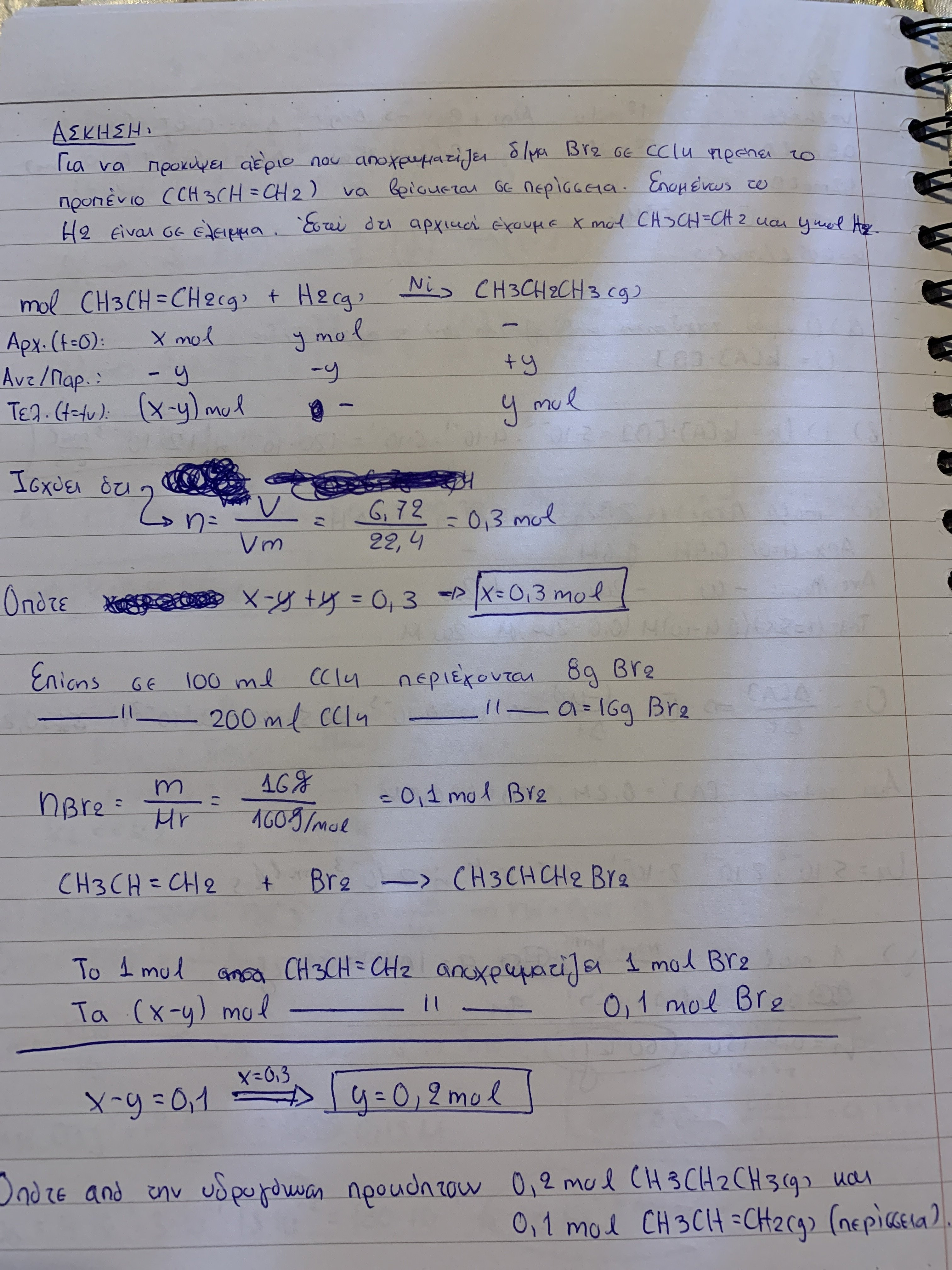 (Γνωρίζω πως το αυτό που προκύπτει είναι αλκανιο και συγκεκριμένα το προπανιο, όμως αυτό δε μπορεί να αποχρωματισει Br2 σε CCl4, συνεπώς περισσεύει και προπενιο) γενικότερα η σκέψη μου είναι λίγο μπερδεμένη και συγγνώμη γι αυτό, απλώς θαρρώ πως το καλοκαίρι δε με βοηθά να συγκεντρωθώ τόσο όσο πρέπει κι αυτο δεν είναι ότι καλύτερο
