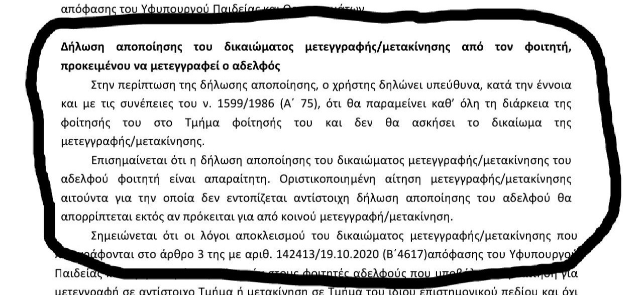 ΚαλημεραΑυτό είναι απο την περσινη εγκυκλιο. Δεν καταλαβαίνω το εξής: Εάν πχ εγώ είμαι πρωτοετης που μπορω να παρω μετεγγραφή εκεί που σπουδαζει ο αδερφός μου και ο αδερφός μου έχει κάνει χρήση του δικαιώματος της μετεγγραφης με κοινωνικοοικονομικά κριτήρια όταν ήταν ο ίδιος πρωτοετης, υπάρχει προβλημα στην μετεγγραφή μου; Θα μπορει ο αδερφός μου να κάνει δήλωση αποποιησης ενώ ήδη έχει κάνει μετεγγραφή όταν ήταν στο πρωτο έτος; Η δήλωση αυτή αφορά το μέλλον; Αυτο σημαίνει ότι μπορεις να κάνεις μετεγγραφή περισσοτερες από μία φορά; Ελπίζω να μην σας μπερδεψα....View attachment 121679