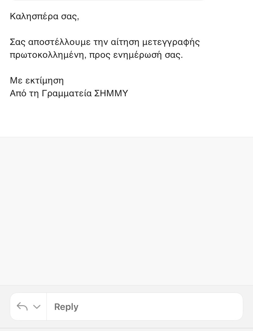 Μόλις τώρα μου ήρθε αυτό το email από τη γραμματεία της σχολής. Μπορεί κάποιος να μου εξηγήσει τι πρέπει να κάνω? Πρέπει να στείλουν το πιστοποιητικό μετεγγραφής από το παλιό τμήμα στο καινούργιο ή πρέπει να το πάω εγώ??