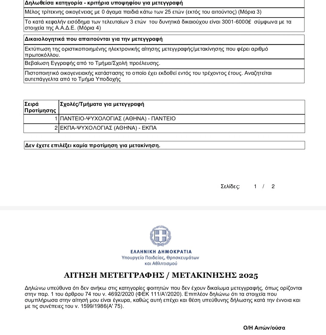 καλησπέρα! Ένας φίλος μου θέλει να κάνει αίτηση μόνο για μετακίνηση. Γίνεται; Γιατί στις μετεγγραφες τον βάζει να επιλέξει