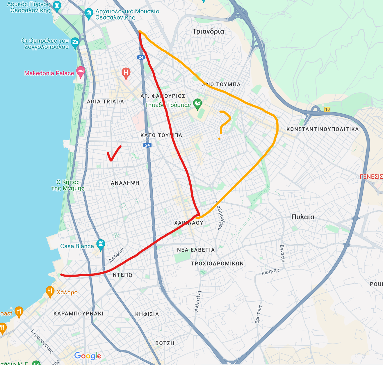 Εγώ εδώ προτείνω, λαμβάνοντας υπόψιν την απόσταση, τα αστικά και την ασφάλεια. 40 εκκλησιές και Τριανδρία ποτέ δε μου πολυάρεσαν να σου πω την αλήθεια λόγω ανηφόρας και λίγων αστικών. Τούμπα όχι και τόσο με την έννοια ότι θα εξαρτασαι μονο απο το 14 & 37 και οτι θα κλεινεσαι μεσα οταν παιζει ο παοκ (οι δρομοι τριγυρω απο το σταδιο κλεινουν και τα αστικα πανε απο αλλου + θεματα οπαδικης βιας, εκτος αν εισαι παοκ και δε σε νοιαζει αυτο). Πχ από Τούμπα αν θες να πας ανατολικα ικεα ή κτελ με βαλιτσες θα πρεπει να αλλαξεις δύο αστικα. Βέβαια η Άνω Τούμπα είναι όμορφη να την περπατάς (τη Λαμπράκη με τα μαγαζιά). Γενικά σου προτείνω φουλ να διαλέξεις σπίτι κοντά σε βασική αρτηρία αστικών, είτε αυτή είναι η εγνατία-καραμανλή είτε η Βασ. Όλγας (ή έστω να είσαι 5' με τα πόδια από εκεί) ώστε να έχεις ανά πάσα στιγμή πρόσβαση σε πολλές γραμμές αστικών και κυρίως τα 2Κ και 1Χ που διασχίζουν όλη την πόλη και σε πάνε και κτελ περνώντας από κέντρο. Αν δεν βρεις κάτι καλό κέντρο, τότε σου προτείνω φουλ τις ανατολικές περιοχές εντός της κόκκινης γραμμής στη 2η εικονα με το τικ, που είναι κάτω από παπαναστασίου (χαριλάου), ιδανικά κάτω από Λεωφ. Καραμανλή. Αν μένεις εκεί, επειδή είσαι ανάμεσα σε καραμανλή και όλγας θα έχεις άμεσα πρόσβαση σε όλα τα αστικά (είτε από πάνω καραμανλή είτε από κάτω Όλγας) στη χειρότερη περπατώντας 5-10' μέχρι τη στάση. Αν είσαι προς τα κάτω Όλγας, έχεις 3K, 5, 6 που σε βγάζουν σε όλη την Τσιμισκή κέντρο και το 1Χ (σε κάποιες στάσεις) που σε ανεβάζει πανεπιστήμια από 3η Σεπτεμβρίου. Αν είσαι εντελώς ανάμεσα, έχεις την Δελφών από όπου περνάνε τα 33, 39, 7 αλλά και πλέον από Νοέμβριο και το μετρό. Αν είσαι προς τα πάνω στην καραμανλή τότε έχεις ακόμα περισσότερες γραμμές. + όσα είπαμε για Καλαμαριά.
