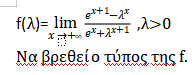 Όχι ιδιαίτερα δύσκολη ασκησούλα, αλλά είναι μια καλή γενική πάνω στα όρια που όποιος την δοκιμάσει θα καταλάβει εάν έχει κενά και εάν χρειάζεται να εξασκηθεί παραπάνω. Μου αρέσει πάντως πολύ το γεγονός απο άποψη ιδέας οτι ορίζει συνάρτηση μέσω ορίου. Δεν συνηθίζεται τόσο στο λύκειο ή μάλλον ξεχνιέται οτι μπορεί να γίνει(η e^x ορίζεται και έτσι ουσιαστικά μεταξύ άλλων τρόπων). Οπότε είναι καλή για να ψαρώσει κάποιον πιστεύω. Αλλά και μια ευκαιρία για να καταλάβει ο μαθητής πόσο ελαστικές είναι οι έννοιες που μαθαίνει.