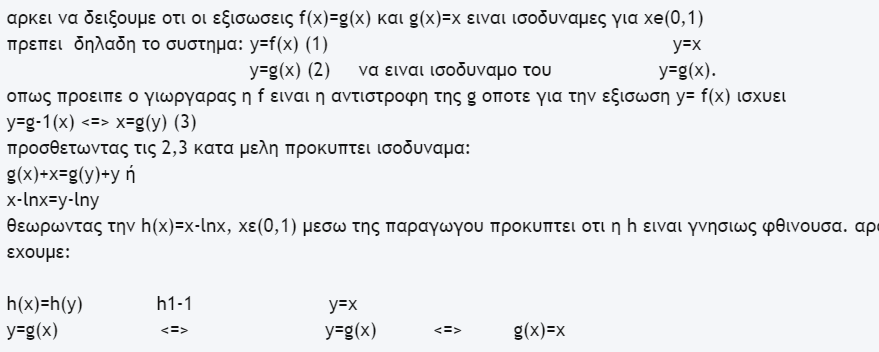 η μονοτονια της h δεν βγαινει τοσο συμβατικα ,επισης αυτο που γραφεις ειναι λαθος στο β)Το α με μονοτονια στην h, το β ισως ετσι, αρκει νδο οτι f(x)=g(x) <=> f(x) = x ή g(x) = x.