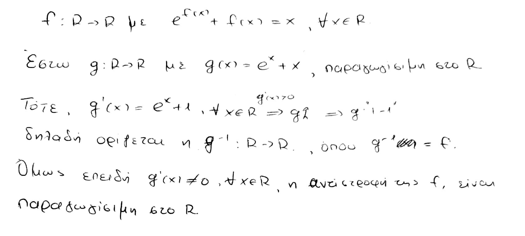 ξερεις οτι η g^-1 ειναι συνεχης συναρτηση?Αφού βρήκαμε πως η παραγωγος της αντίστροφης της f είναι θετική και δεν μηδενίζεται (συνεπώς η f δεν έχει κατακόρυφη εφαπτομένη) τότε και η f αφού είναι η αντιστροφη της g θα είναι παραγωγίσιμη σε όλο το πεδίο ορισμού της g το R. Νομίζω τα δεδομενα αρκούν για να αναφερθω στη παραγωγισιμοτητα της f.Αν κατάλαβα καλά τι εννοείς.