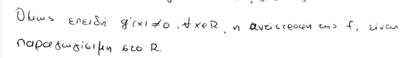 Αφού βρήκαμε πως η παραγωγος της αντίστροφης της f είναι θετική και δεν μηδενίζεται (συνεπώς η f δεν έχει κατακόρυφη εφαπτομένη) τότε και η f αφού είναι η αντιστροφη της g θα είναι παραγωγίσιμη σε όλο το πεδίο ορισμού της g το R. Νομίζω τα δεδομενα αρκούν για να αναφερθω στη παραγωγισιμοτητα της f.Αν κατάλαβα καλά τι εννοείς.View attachment 100964