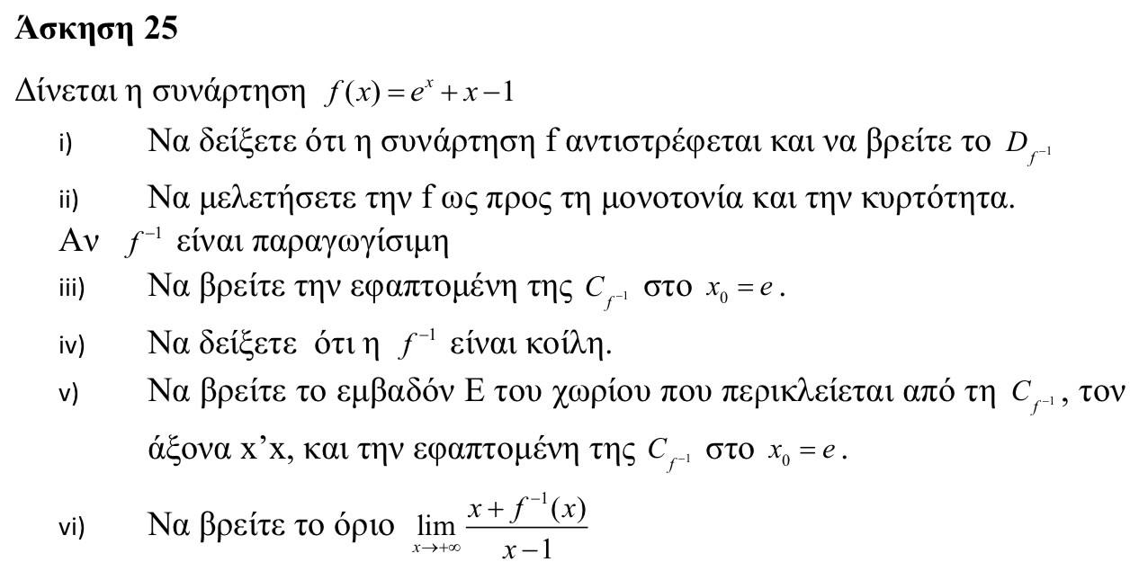 Αυτό που με είχε παραξενέψει στο v ήταν το πώς θα σχεδιάζαμε τη γραφική παράσταση της αντίστροφης της f, για να βρούμε το εμβαδό του Ε που περικλείεται από 3 συναρτήσεις (και άρα χρειάζεται σχήμα), εφόσον δε μπορούμε να βρούμε τον τύπο της.