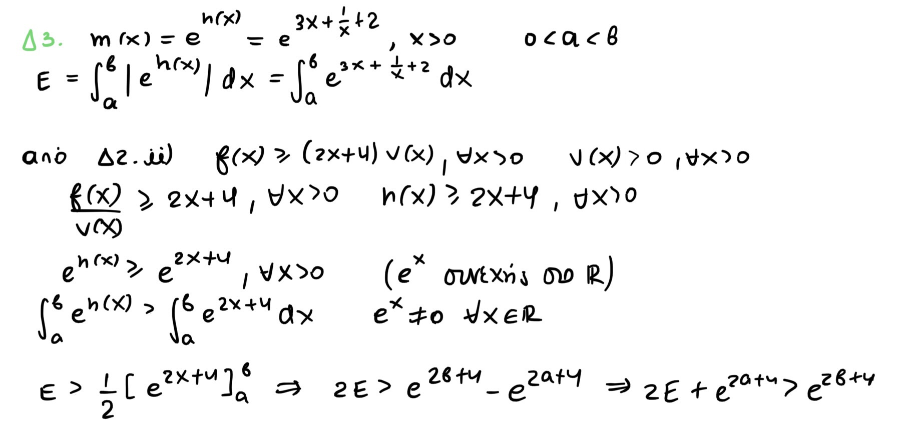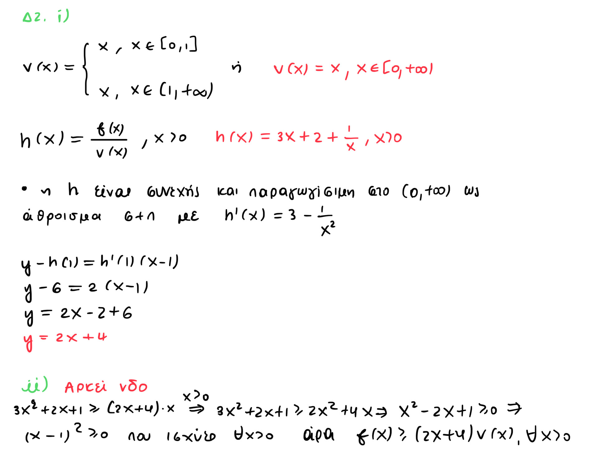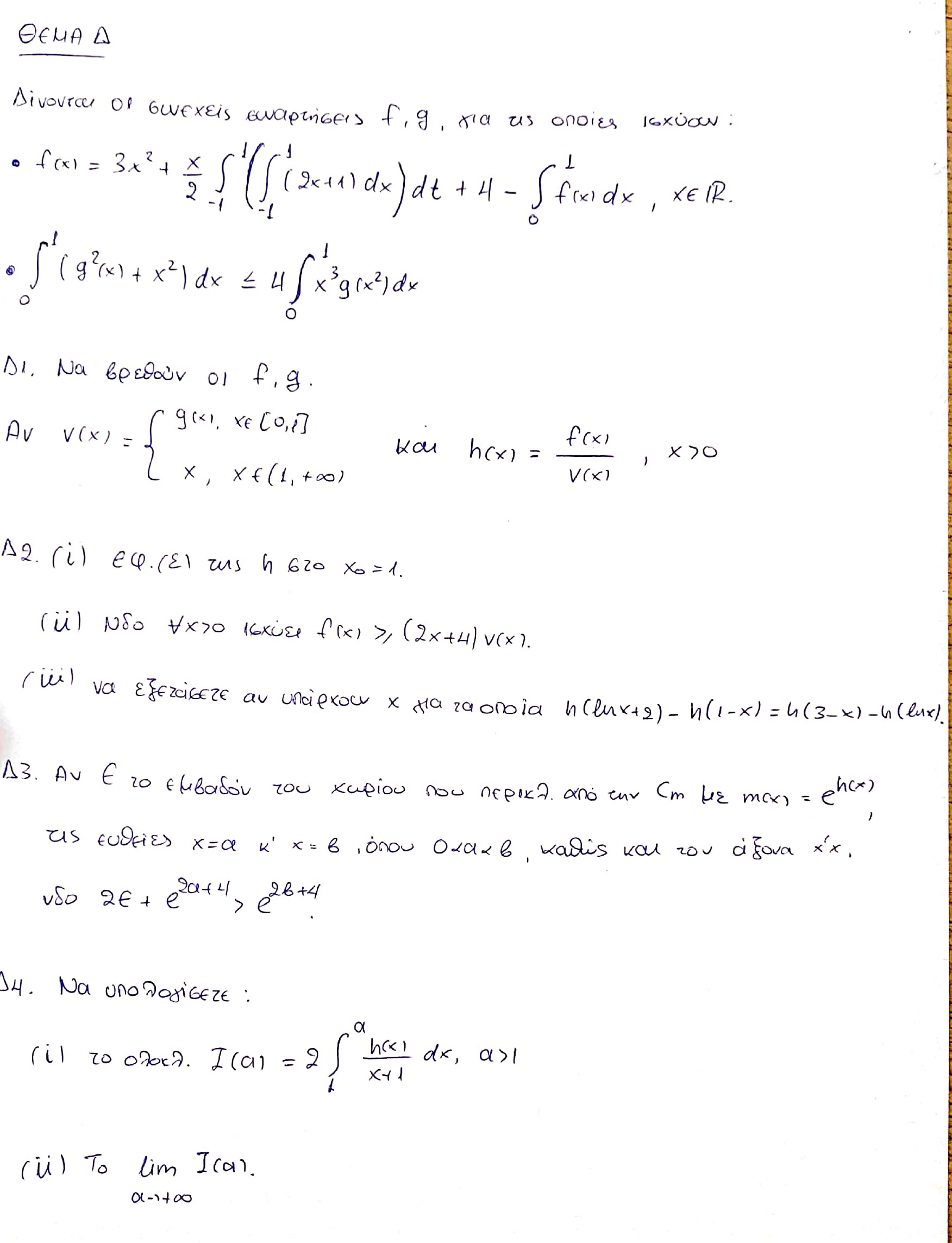Για το Δ2.iii) όπως έχω πει πιο πάνω, ίσως υπάρχει κάποιο ορθογραφικό, γιατί αλλιώς μου φαίνεται πολύ σύντομη η απάντηση…Πάντως, υπάρχει μοτίβο και κάτι ίσως μπορεί να γίνει, αν θέσουμε φ(x)=h(x+2)+h(x), x>0 και χρησιμοποιήσουμε τη μονοτονία/1-1.