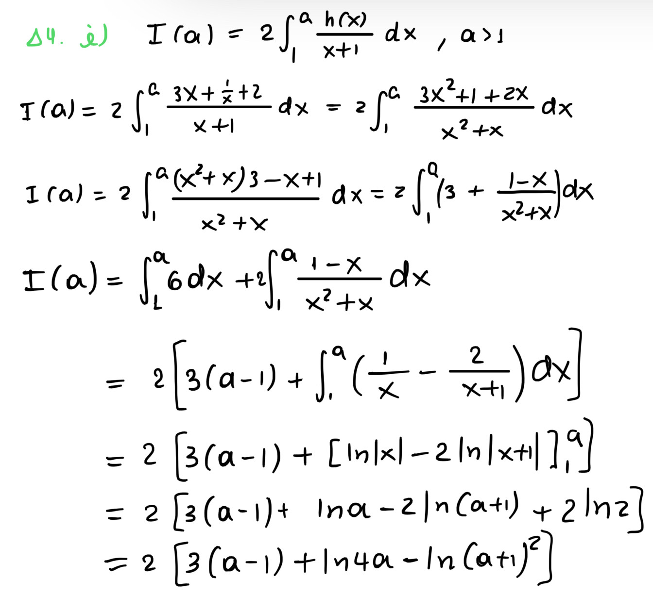 Στην αρχή στο Ι(α) υπάρχει ο όρος 2(3(α-1)) που βγαίνει 6α-6 και το -6 το βγάζω έξω από το όριο, γιατί είναι σταθερός αριθμός. Πρακτικά, το έκανα, για να με διευκολύνει λιγουλάκι.Δεν κατάλαβα στο Δ4 από πού προέκυψε το 6.