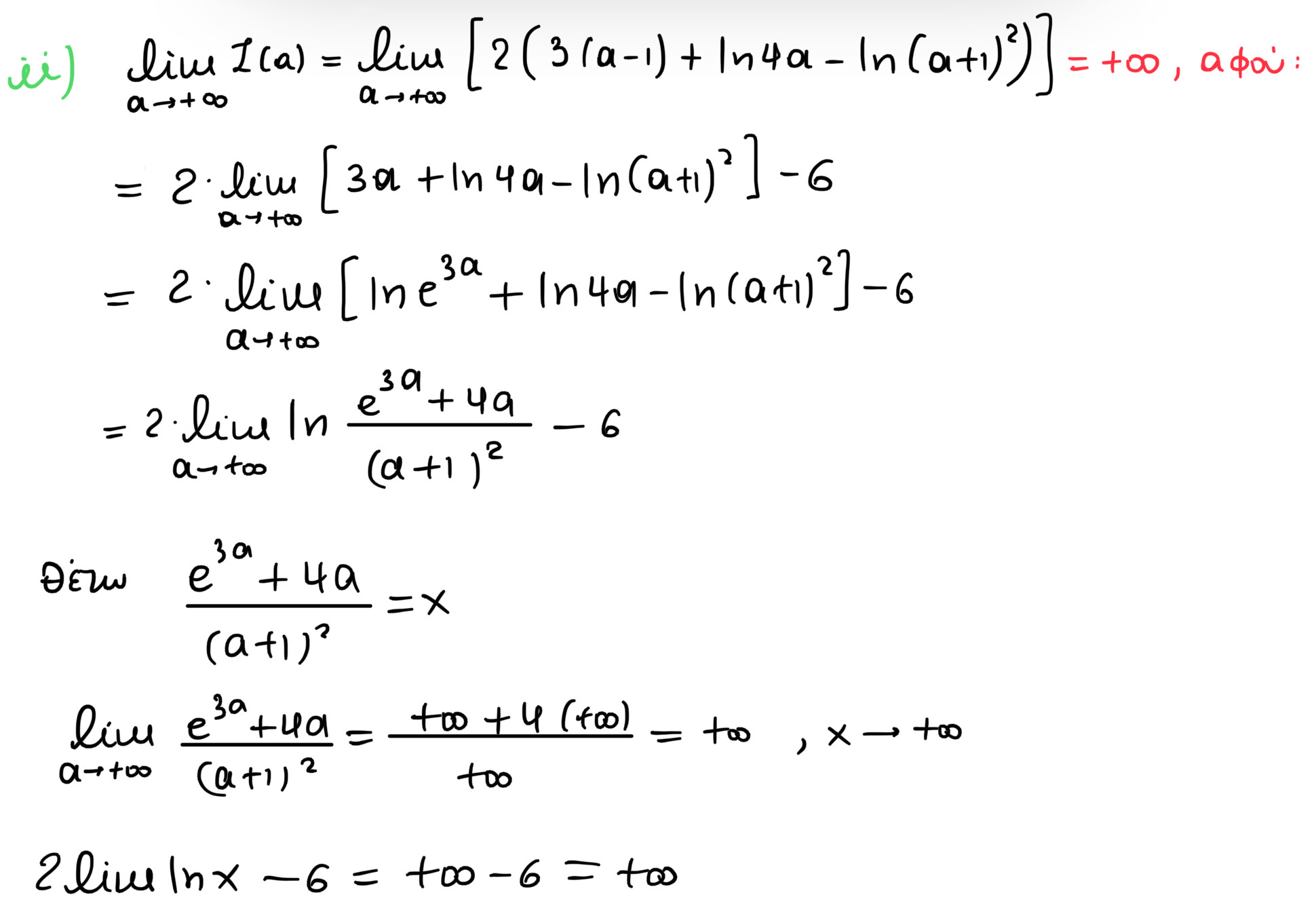 Το 2 δε πάει και στους τρεις όρους ;Στην αρχή στο Ι(α) υπάρχει ο όρος 2(3(α-1)) που βγαίνει 6α-6 και το -6 το βγάζω έξω από το όριο, γιατί είναι σταθερός αριθμός. Πρακτικά, το έκανα, για να με διευκολύνει λιγουλάκι.