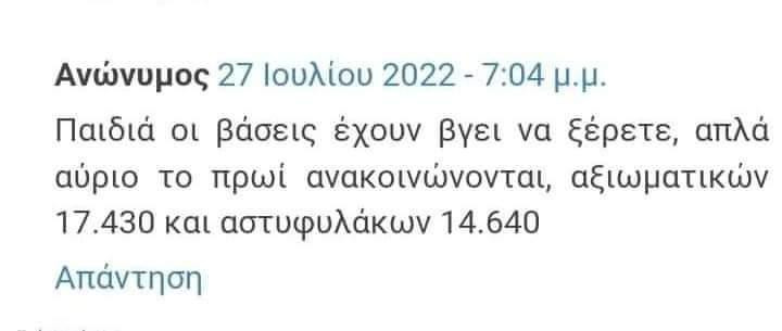Αλεξ εγω πιστεύω ότι θα είναι κάπου στην μέση δηλαδή 14.300 -500 εκει.. θεωρώ πολύ έξω την εκτίμηση του φλωροπουλου καθώς ο αριθμός των εισακτέων είναι τριπλάσιος σχεδόν στην γενική σειρά και επιπλέον μειώθηκαν και οι αριστούχουι και γενικά το μεγαλύτερο ποσοστό δεν έγραψε καλα. Εδώ λένε για νομικές και ιατρικές θα μειωθούν 500 μορια και θα μειωθεί η αστυφυλακων μόνο 600 που παίρνει τους διπλάσιουςΠαιδιά μας έχουν τρελάνει άλλος λέει 13 600 ! Άλλος 15 700! Είναι ανώφελο πια να βλέπουμε εκτιμήσεις .. Μέχρι μεθαύριο θα ανακοινώνουν και θα ξέρουμε επιτέλους ! Καλή επιτυχία σε όλους !