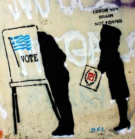 Είδα αυτή την εικόνα κάπου στο ίντερνετ και πιστεύω ότι ταιριάζει απόλυτα στο χθεσινό εκλογικό αποτέλεσμα.Δεν μπορώ να διανοηθώ ότι στη χώρα από την οποία κάποτε ξεκίνησε η Δημοκρατία, να εκλέγεται ως 3ο ένα κόμμα(; ), οργάνωση(; ), κίνημα(; ) (δεν ξέρω πως να το αποκαλέσω) του οποίου οι απόψεις και οι αντιλήψεις είναι ΚΑΘΑΡΑ φασιστικές, ακόμα κι αν αυτοί οι ίδιοι το αρνούνται και το παίζουν αθώα περιστεράκια!