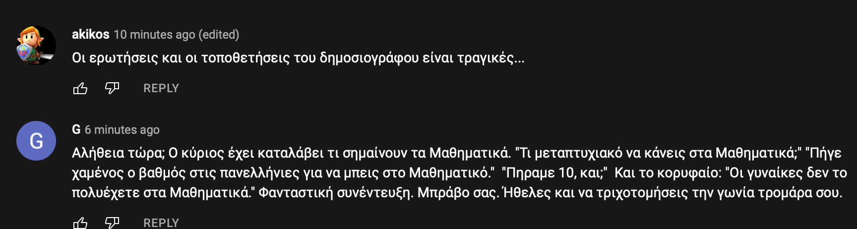 Τι θα μπορούσε να πει; Έχει καμία εμπειρία πάνω στα Μαθηματικά πέρα από την εξαμηνιαία ύλη του προγράμματος; Νέα κοπέλα δίχως εργασιακή εμπειρία είναι, δεν έχει ασχοληθεί σε πολλά επίπεδα με την επιστήμη και είναι κρίμα πως την αντιμετωπίζουν δείχνοντας για μια ακόμη φορά ότι όποιος σπουδάζει Μαθηματικά και του αρέσει, είναι μαϊντανός για το Ελληνικό κράτος γιατί δεν υπάρχει κάποια επιπλέον εξέλιξη ή ενδιαφέρον σε αυτό. Είναι κάπως δεδομένο ότι όποιος σπουδάζει Μαθηματικό ξέρουμε ότι δεν ήθελε Μαθηματικά, και ότι θα καταλήξει άνεργος ή να δουλεύει για 3.5 ευρώ δυό-τρεις φορές τη βδομάδα, σε φροντιστήριο χωρίς ένσημα. Σαν άποψη είναι τελείως άθλια και ρατσιστική.