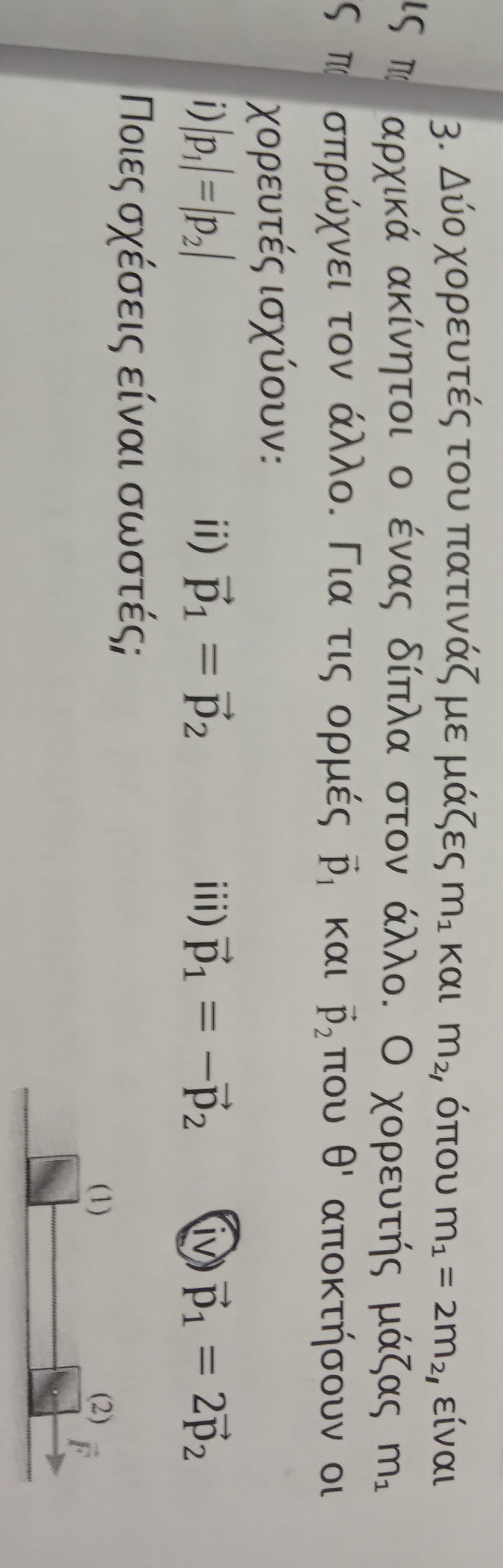 Εχω βρει το 4 αλλα εχω αμφιβολιες επειδη οταν ο χορευτης μαζας m1 ασκησει δυναμη στον χορευτη μαζας m2 ο m1 θα παει προς τα πισω αρα θα εχει αρνητικη ορμη δεν ξερω εχω μπερδευτει