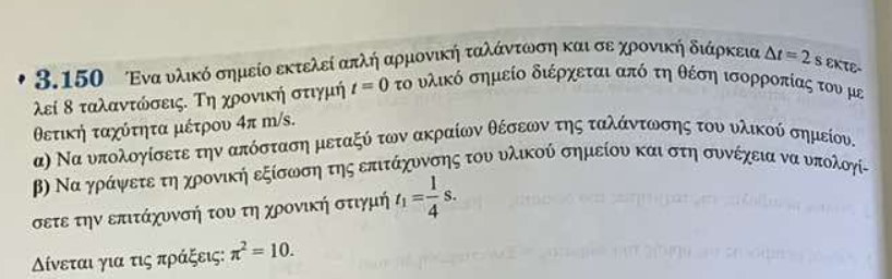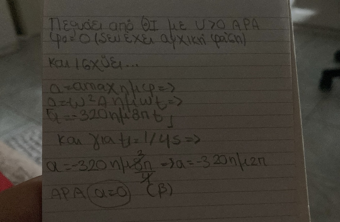 α =-ω^2 * Α * ημ(ωt + Φο). Κάνεις αντικατάσταση και μετά βαζεις οπου t το 1/4 και λυνεις τριγωνομετρική. Δεν εχω χαρτί μπροστά μου να το λύσω αλλά λογικά θα το βρεις. Ελπίζω να σε βοηθησα, μαθητής είμαι και εγώ δίνω το 2025