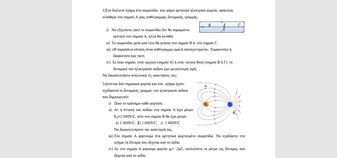 Σωστα οι παραλληλες γραμμες ειναι το ομογενες αλλα εδω το σχημα που εχουμε δεν επιτρεπει αλλη εξηγηση.Όχι. Μία ευθεία δυναμική γραμμή δεν σημαίνει ότι το πεδίο είναι ομογενές...