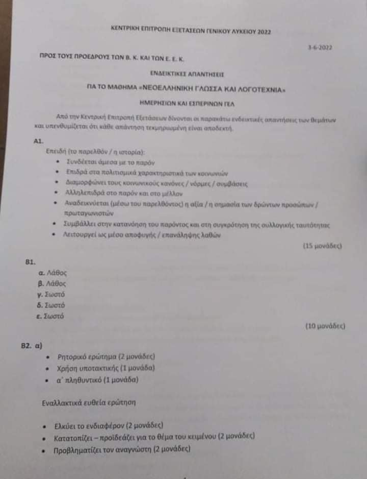 Ας μην ξεχνάμε ότι οι απαντήσεις είναι ενδεικτικές και κάθε απάντηση επαρκώς τεκμηριωμένη είναι αποδεκτή, αρκεί να έχει στηριχθεί σωστά και να έχει συνδεθεί με το κείμενο. Ειδικά στη Ν. Γλώσσα κάτι που μπορεί εκ πρώτης όψεως να μην το βλέπουμε στις απαντήσεις, υπάρχουν μεγάλες πιθανότητες ο βαθμολογητής να το θεωρήσει σωστό. (Ειδικά για την ερώτηση Β3 για παράδειγμα ή τη λογοτεχνία)