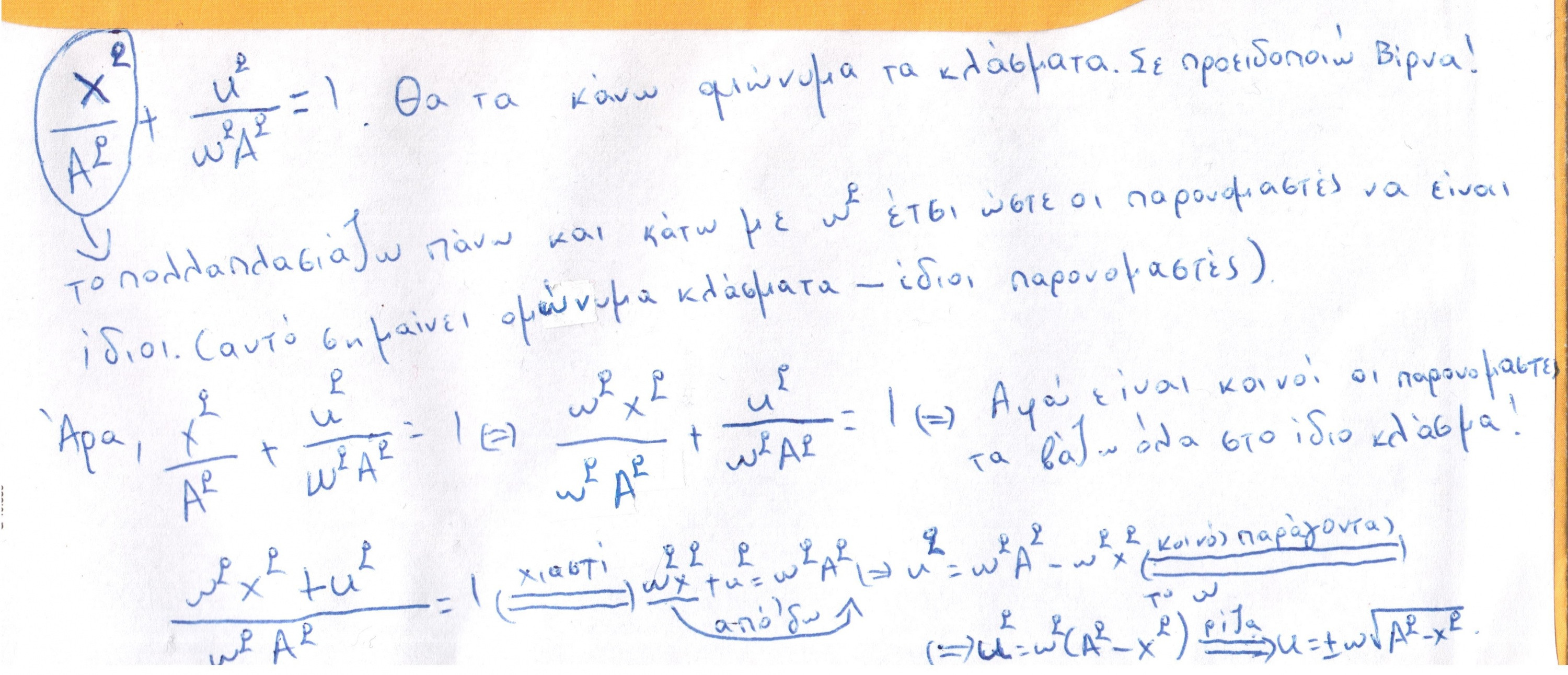 Θέλω μια βοήθεια στην παρακάτω απόδειξη λύσης , πως από το χ² / Α² + υ²/ ω²Α² = 1 πάει στο επόμενο , κάποιος αναλυτικά και να μου δείξει αναλυτικά πως βγαίνει η απόδειξη ;