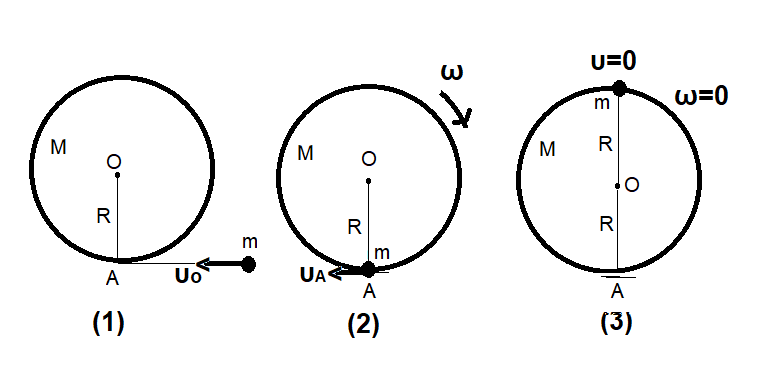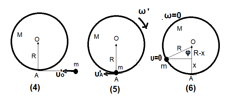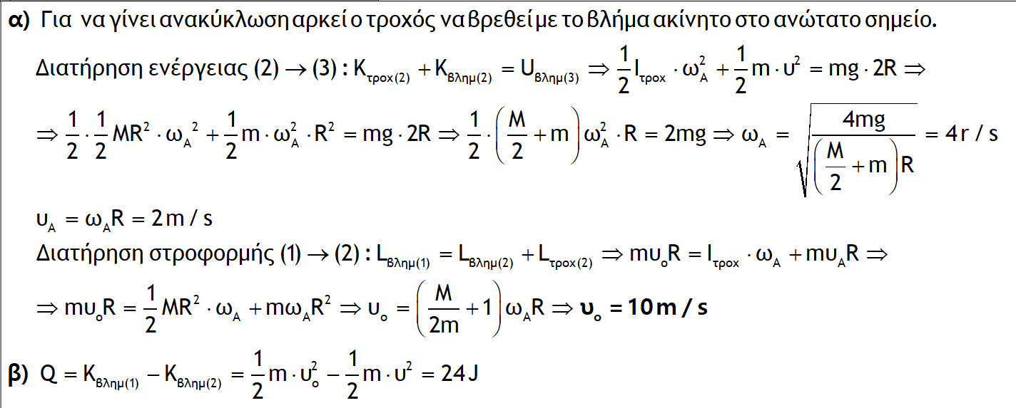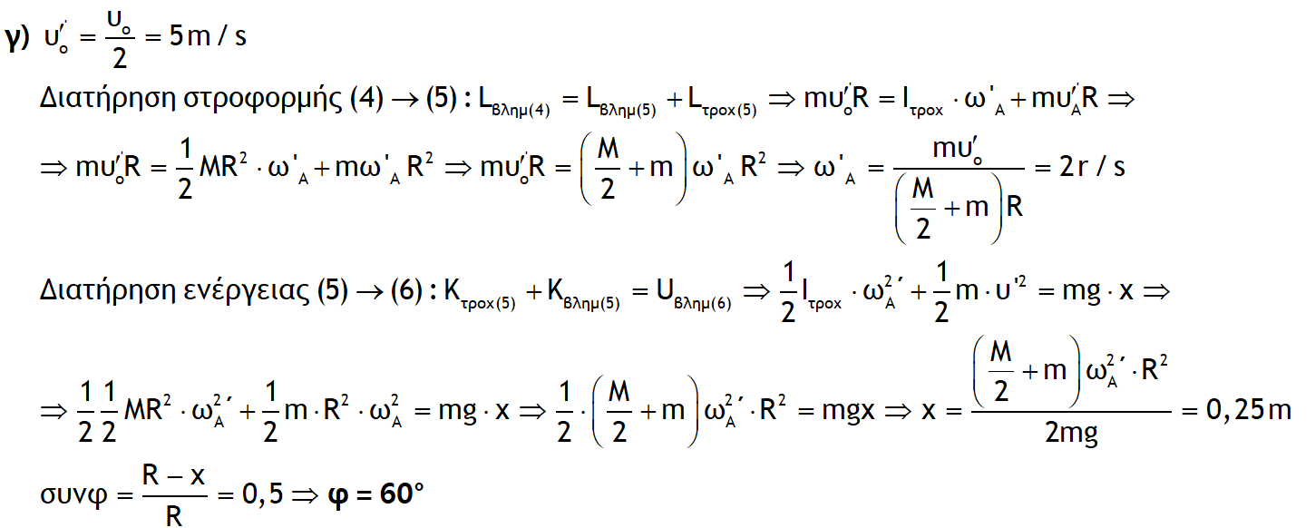 Εφόσον η σφαίρα πριν σφηνωθεί στον κύλινδρο, έχει αρχική ταχύτητα Uo/2 = 5m/s < 10m/s ...είναι σίγουρο οτι ο κύλινδρος δεν θα κάνει ανακύκλωση. Σε αυτό το σημείο η σφαίρα θα έχει φτάσει σε σημείο h πάνω απο το κατώτερο σημείο του κυλίνδρου. Απο την αρχή διατήρησης της στροφορμής(εξίσωση 1), θα βρούμε την ταχύτητα της σφαίρας αμέσως μετά την στιγμή που σφηνώθηκε :