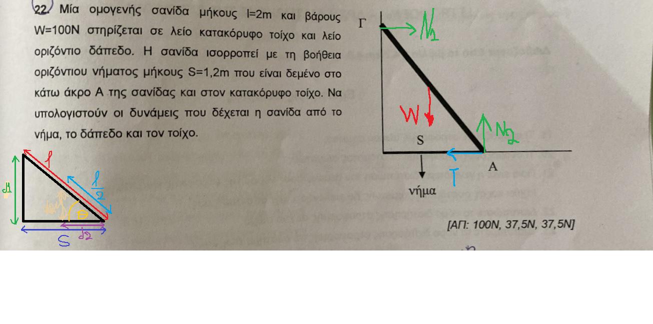 Όπου d1 και d2 είναι οι κάθετες ως προς τον φορέα των δυνάμεων N1 και W αντίστοιχα αποστάσεις απο τον άξονα περιστροφής. Στο τριγωνάκι που σου έχω κάνει κάτω αριστερά στην εικόνα φαίνεται ξεκάθαρα πως το d1 είναι το μήκος της πλευράς ενός ορθογωνίου τριγώνου με μήκος υποτείνουνας l = 2 m και και δεύτερης πλευράς μήκους S = 1.2 m. Απο το πυθαγόρειο θεώρημα λοιπόν θα ισχύει πως :