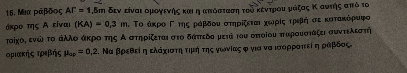 Την μια εξίσωση την έκανες για να βρεις την αντίδραση. Σου περισσεύει μία. Άρα θες άλλη μια για να σχηματίσεις σύστημα, και αυτή θα δοθεί από τον δεύτερο νόμο του Νεύτωνα για την περιστροφική κίνηση καθώς έχουμε στερεό σώμα , άρα μπορεί να δεχθεί ροπές και να περιστραφεί. Εμάς όμως το σώμα βρίσκεται σε ισορροπία, άρα :