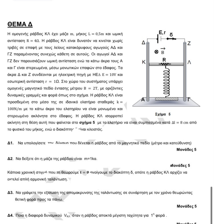 Στο Δ3 πρέπει να βρεις το πλάτος της ταλάντωσης και την αρχική της φάση . Η συχνότητα καθορίζεται απο την μάζα του αγωγού και την σταθερά των ελατηρίων που σου είναι γνωστά απο τα δεδομένα ή τα έχεις υπολογίσει απο τα προηγούμενα ερωτήματα .View attachment 115433