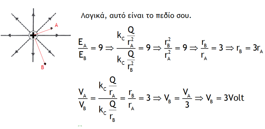 Ααααααααχχχ!"Ο λόγος των δύο εντάσεων σε διαφορετικά μέρη είναι Εa/Εb=9. Επιπλέον, το δυναμικό στο σημείο Α είναι V=-9 Volt. Ποιο είναι το δυναμικό στο σημείο B?" Οι πιθανές απαντήσεις είναι -3, -1, -27.