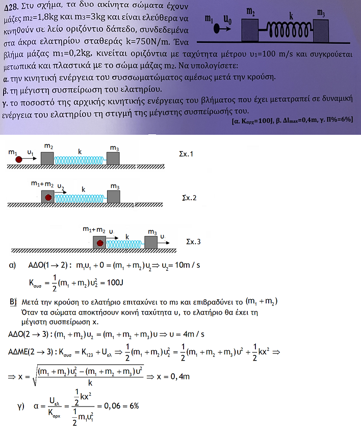 Μπορεί καποιος να μου λύσει αυτη την άσκηση ή να μου παραθέσει μια μεθοδολογία για τις ασκήσεις πλαστικής κρούσης που περιλαμβάνουν ελατήριο; Αυτη τη στιγμή είμαι στο κεφάλαιο διατήρηση της ορμής Β´ λυκείου και έχω καταλαβει τις κρούσεις αλλά ελατήριο έχω να συναντήσω από το γυμνασιο.