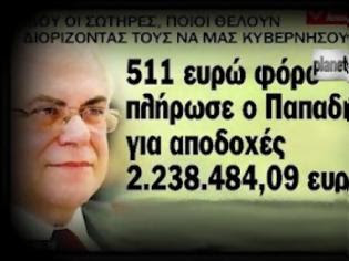 Τα εκκαθαριστικά της εφορίας που φέρνει στη δημοσιότητα η εφημερίδα Το Παρόν, αποδεικνύουν ότι ο κ. Παπαδήμος, από το 2004 έως το 2011 εισέπραξε ως αντιπρόεδρος της Ευρωπαϊκής Κεντρικής Τράπεζας, συνολικά 2.238.484,09 ευρώ και πλήρωσε φόρο μόλις 511 ευρώ.